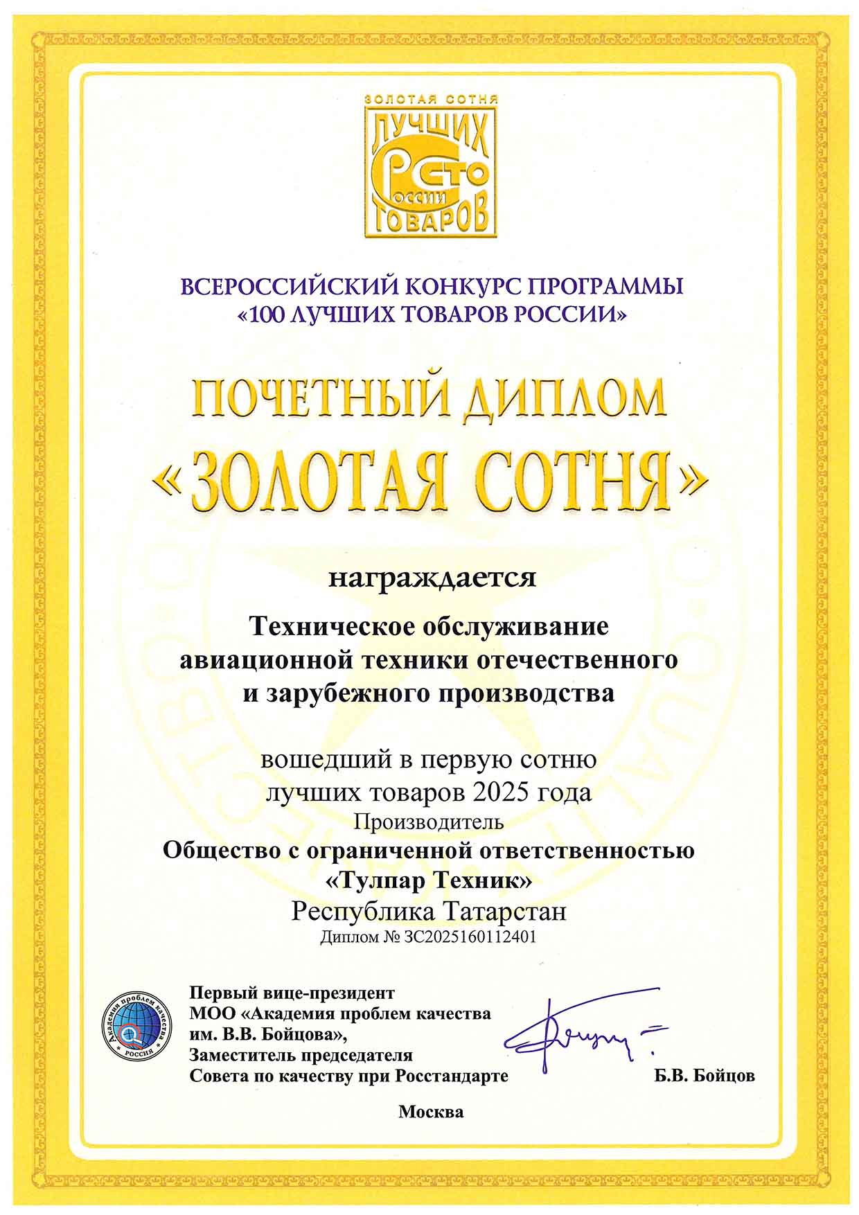 Конкурс «100 лучших товаров России» – «Техническое обслуживание и ремонт ВС»