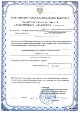 ООО УК «Тулпар Аэро Групп» Лицензия на разработку, производство, испытание и ремонт авиационной техники Свидетельство промышленной площадки Авиакомпания «Тулпар» Свидетельство эксплуатанта АОН № АОН-08-19-130 (до 03.06.2026) Сертификат эксплуатанта КВП № 587 (от 27.11.2023) ООО «Тулпар Техник» Сертификат ФАП-145 Сертификат разработчика авиационной техники Сертификат EASA PART-145 Capability list Сертификат BDA AMO 478 Scope of work Свидетельство о метрологической сертификации Решение о признании действительным Сертификата акционерным обществом "Авиационная администрация Казахстана" от 01.10.2019 г. Bombardier authorized service facility Collins Aerospace Authorized Dealer Свидетельства по расшифровке полетной информации ООО «Тулпар Интерьеры Инжиниринг Дизайн» (ТИИД) Свидетельства о признании РРР Сертификат ISO 9001:2005 Свидетельство об одобрении типа (арамидные панели) Свидетельство о признании РРР (светильники судовые) Свидетельство о признании РМРС (панели композитные судовые) Свидетельство об одобрении типа (светильники судовые) Свидетельство о типовом одобрении (панели композитные судовые) ООО «Тулпар Экспресс» Свидетельство эксплуатанта АУЦ «Академия 033» Сертификат АУЦ №377, выданный 30.11.2023 Федеральным агентством воздушного транспорта Приложение к Сертификату АУЦ №377, выданный 30.11.2023 Санитарно-эпидемиологическое заключение от 18.07.23 о соответствии объекта государственным сан-эпид. правилам и нормам Лицензия на дополнительное профессиональное образование от 29.08.2023